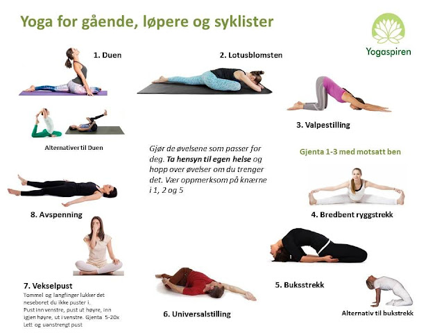 Her er en samling med forslag til små programmer som du kan gjøre. De er veldig enkle i formen, og ikke tenkt å forklare uttømmende hvordan man gjør øvelsene. Det er heller ment som en påminning av øvelser og et forsalg til en god rekkefølge av dem. Mange har gått på kurs, og har fått innføring i øvelsene fra før. Og så finnes det også mye god litteratur om yoga, dersom du skulle ønske å lese deg opp.